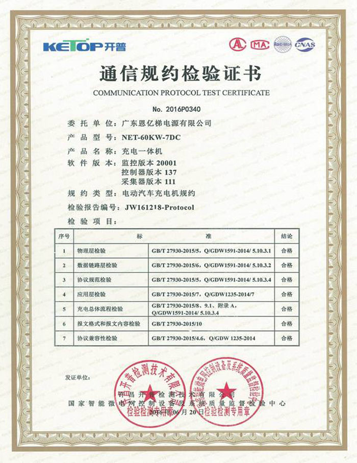 通信規(guī)約檢驗證書(充電一體機)