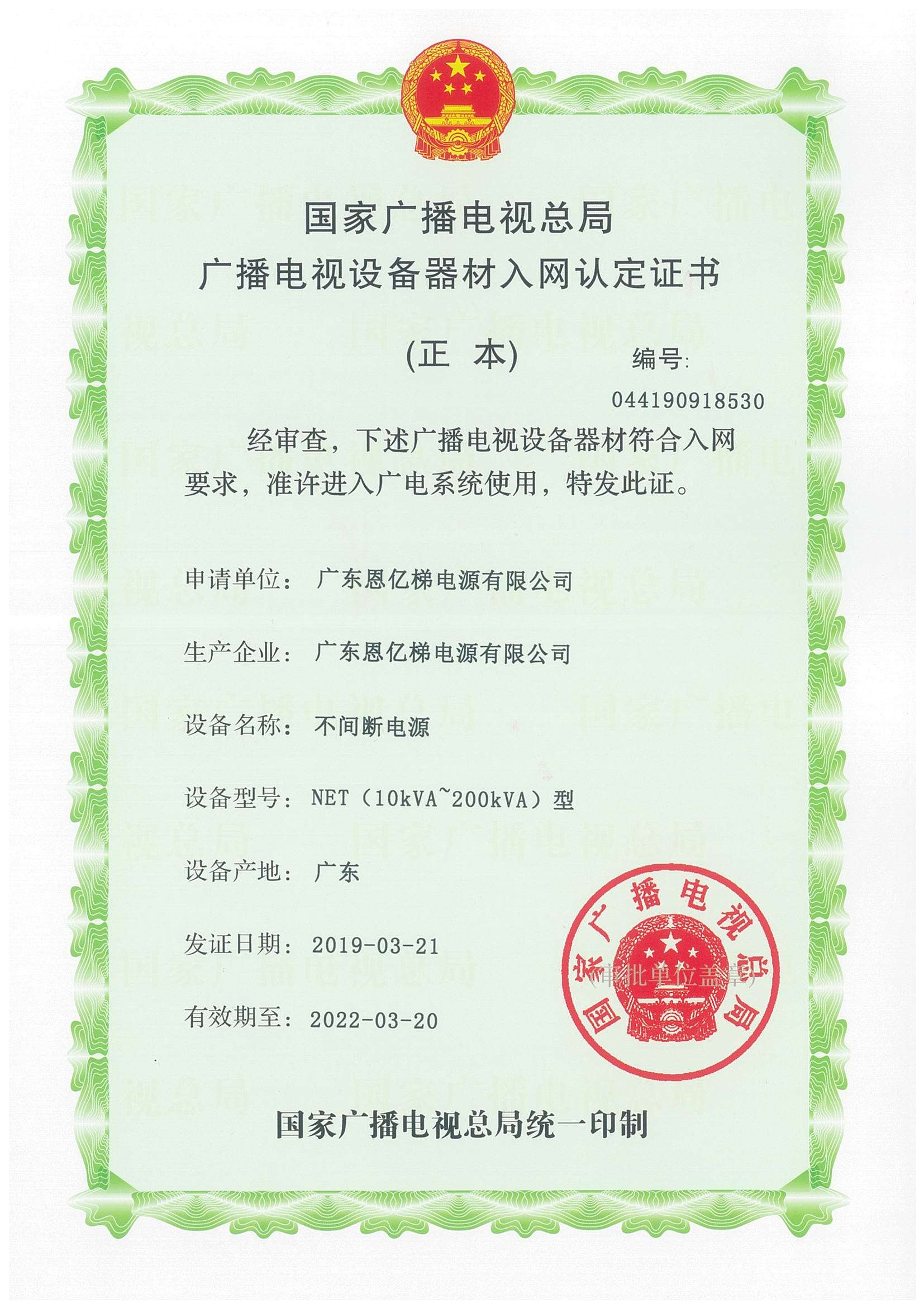 國(guó)家廣播電影電視總局入網(wǎng)認(rèn)定證書(shū)(交流穩(wěn)壓電源)