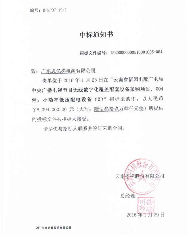 恩億梯電源中標(biāo)云南廣電局中央廣播電視配套設(shè)備采購項目