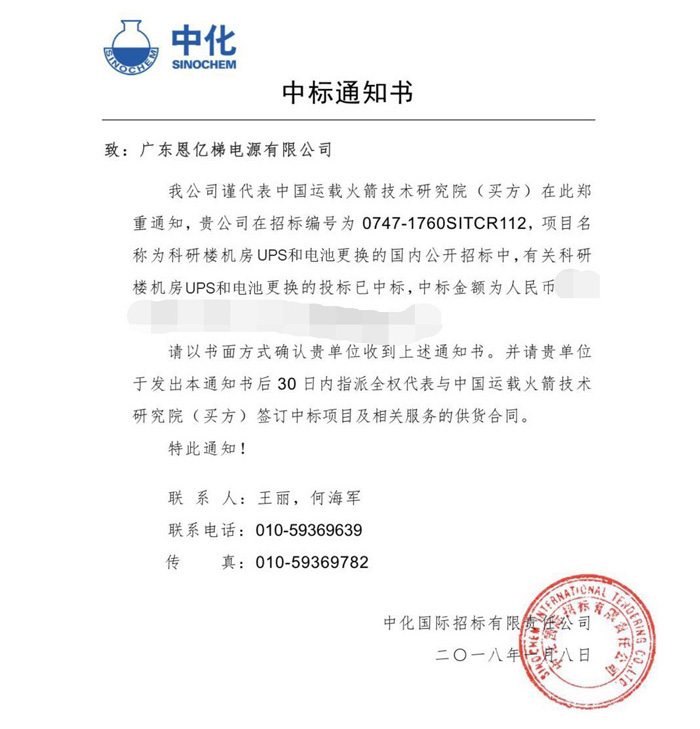 中國(guó)運(yùn)載火箭技術(shù)研究院作為我國(guó)首屈一指的國(guó)防科研單位,其設(shè)備采購(gòu)及供應(yīng)商選擇都有著嚴(yán)格的標(biāo)準(zhǔn),不僅要求競(jìng)標(biāo)企業(yè)提供的產(chǎn)品符合其特定的技術(shù)規(guī)范,還需對(duì)競(jìng)標(biāo)企業(yè)品牌、價(jià)格、服務(wù)、信譽(yù)等方面進(jìn)行全方位的評(píng)審,經(jīng)過(guò)國(guó)內(nèi)多家電源廠商的激烈角逐,最終確認(rèn)恩億梯成功中標(biāo),目前公司已收到中標(biāo)通知書(shū)。